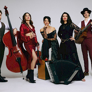 Mitreißende Balkanrhythmen verschmelzen Baba Yaga mit virtuosen Klezmer-Stücken, Gypsy-Jazz und orientalischen Tänzen. Die fünf jungen Musikerinnen und Musiker aus Österreich, Montenegro und Israel heizen jedem Publikum ordentlich ein.